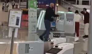 A British man smashed up 10 check-in kiosks and nearby counters during an airport rage before being arrested.