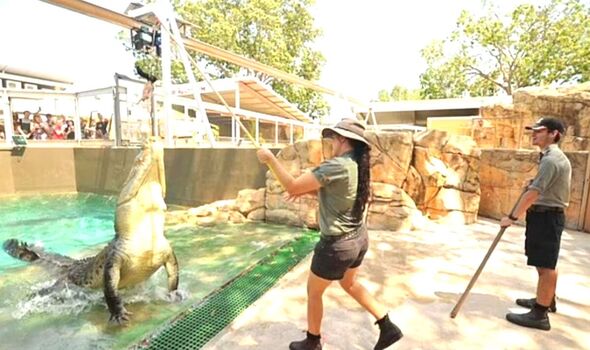 A saltwater crocodile called Leo launched a surprise attack on the female keeper while she was trying to add a plant to the enclosure.
