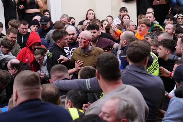 Insane moment ball game in UK town erupts into brutal punch-up as thousands join in