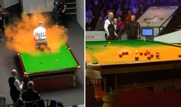 Protestors appeared to throw orange powder on the snooker table.
