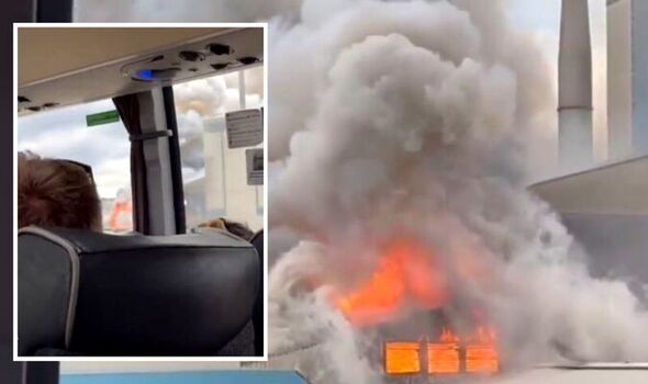 Passengers on-board a coach looked on in horror as thick smoke was seen billowing from a factory in Leeds this afternoon, with flames ripping through the roof.