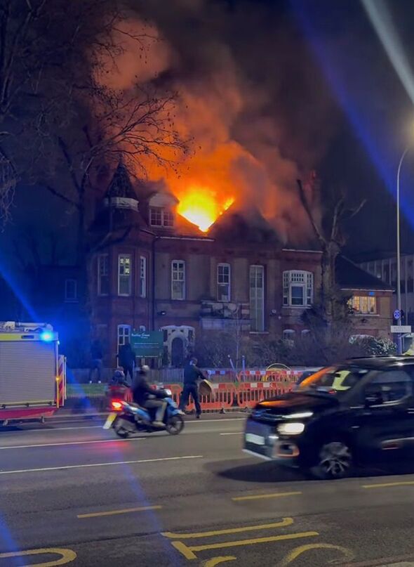 Crews are working to extinguish a fire at a three storey nursery, where part of the roof is burning.