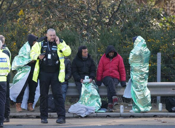 Migrants have been pictured wrapped in foil blankets at the side of the busy motorway.