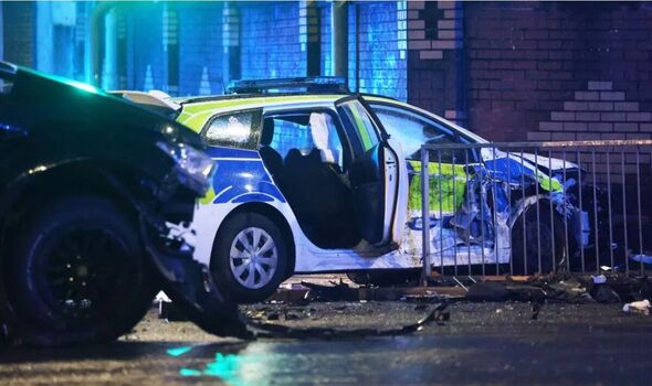 Pictures from the scene show a heavily damaged police car.