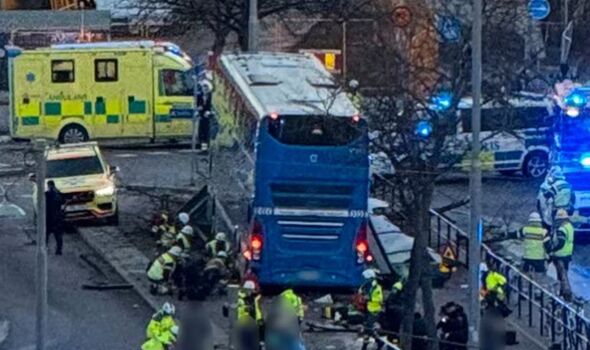Images showed the bus stop flattened after the crash in Stockholm, Sweden.