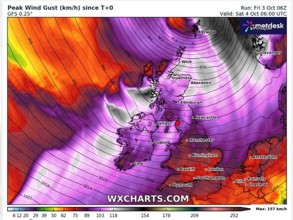 Weather maps are showing purple as winds pick up speed with Storm Amy hitting the country.