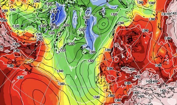 A COLOSSAL high-pressure system stretching 3,000 miles across the Atlantic is about to ‘dislocate’ pushing temperatures in parts of Britain to 33C .